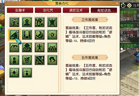 第三种类型的套装是附加状态的,69级花果山门派的玩家可以选择的附加状态的套装有逆鳞跟杀气诀,选择这两个套装的原因是对于69级的绝杀而言,逆鳞根杀气诀增加的伤害属性是比较高的。