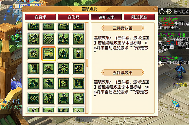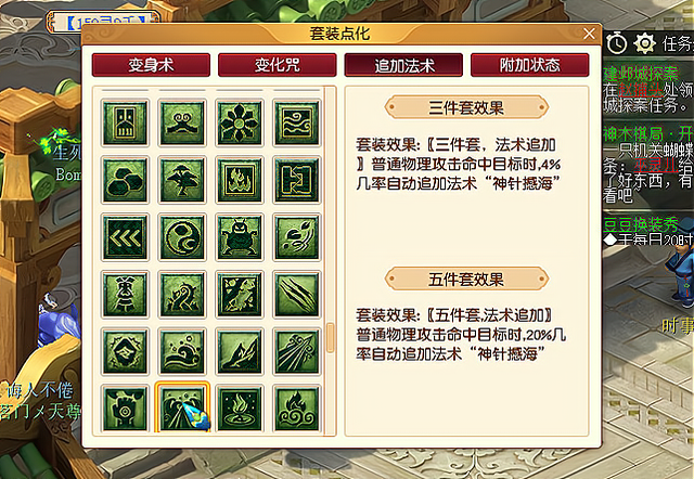 第二种类型的套装是追加物理输出法术的套装,小编建议花果山门派的玩家选择神针探海或者是当头一棒的套装。三件套有4%的几率追加神针探海或者当头一棒,四件套有10%的几率追加当头一棒,20%的几率追加神针探海。