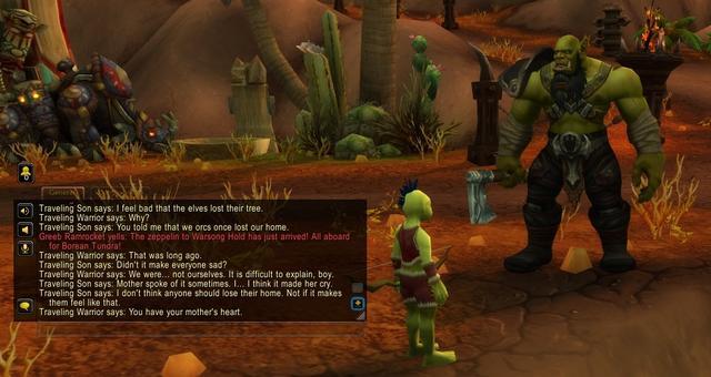 在奥格瑞玛中,有一对兽人父子正在讨论这场部落与联盟之间的战争,这次台词引用了部分《战神》和《辐射》系列 ([源自reddit])