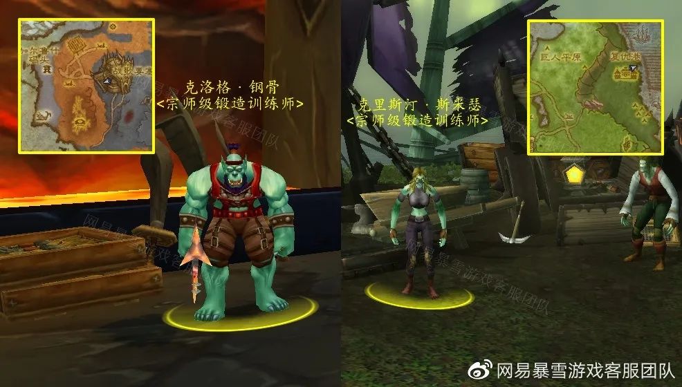 部落可以前往北风苔原的战歌要塞找“克洛格·钢骨”,或者前往嚎风峡湾的复仇港找“克里斯汀·斯米瑟”,以及前往龙骨荒野的阿格玛之锤找“伯鲁斯·折铁”/怨毒镇找“约里克·费姆”将锻造专业提升至宗师级。