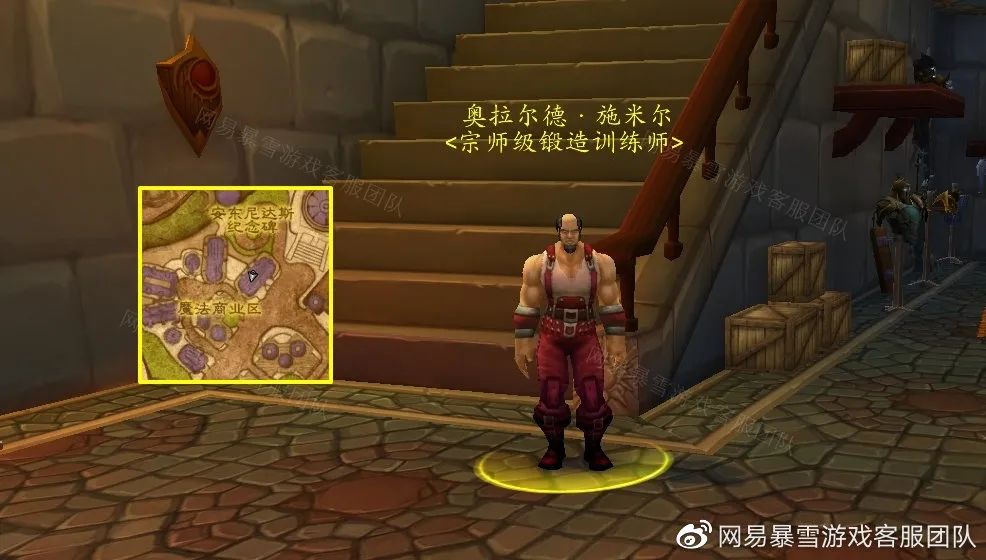 当然也可以前往达拉然,在魔法商业区的坦克用品店找“奥拉尔德·施米尔”,将锻造专业提升至宗师级。