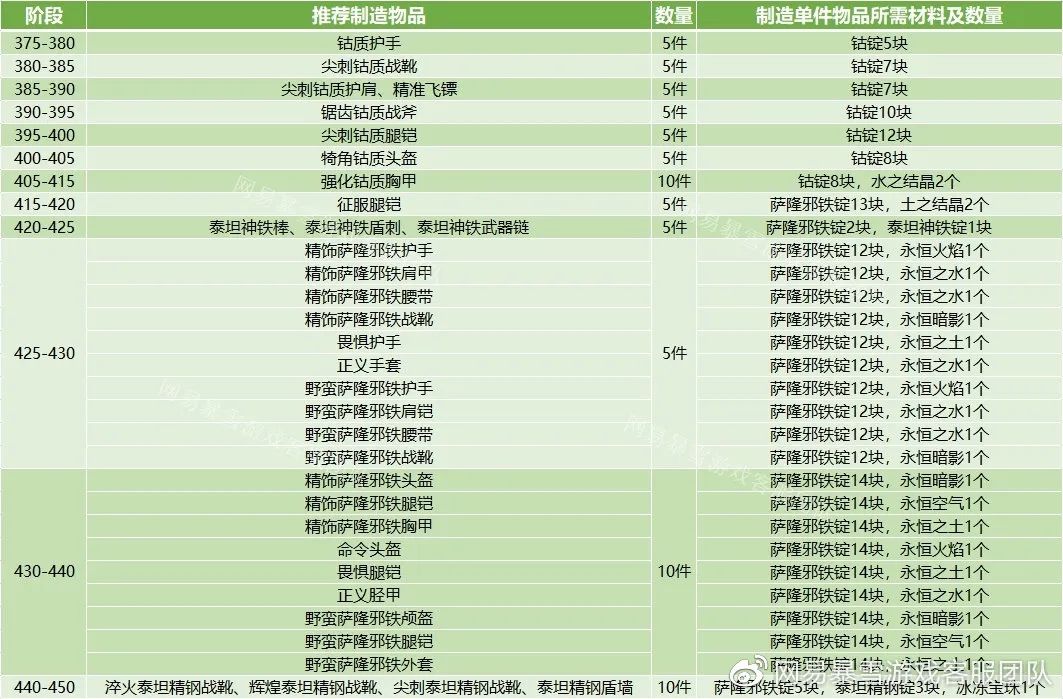 其中425-430和430-440阶段可以根据自己需求部位或永恒元素的价格选择制造。