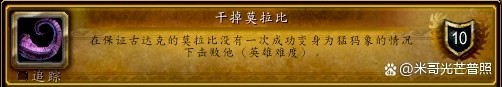 2.干掉莫拉比成就做法:莫拉比每隔一段时间就会试图变身成为一只猛犸象,变身有读条,并且血量低于30%读条只有0.5秒。要做这个成就,就需要强力的输出和一些反应迅速的打断职业。输出越快变身次数就会越少,需要打断的也就越少,特别是30%以下血量一定要强行轰掉BOSS,靠打断机会太渺茫了。