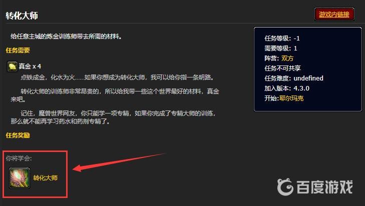 炼金转化配方可以通过完成转化大师任务习得转化大师技能,学习该技能之后炼金专业就可以进行转化。玩家需要在NPC耶尔玛克接取任务,并把4份真金带给任意主城的炼金训练师,就可以完成该任务。