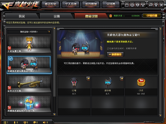 各位cf的玩家们好呀,在每次的版本更新之后,交易所都会重新更新,那么在更新之后英雄级武器玩偶饰品宝箱VI变成什么样了呢?跟着小编一起来看看这次版本之后的交易变化吧!