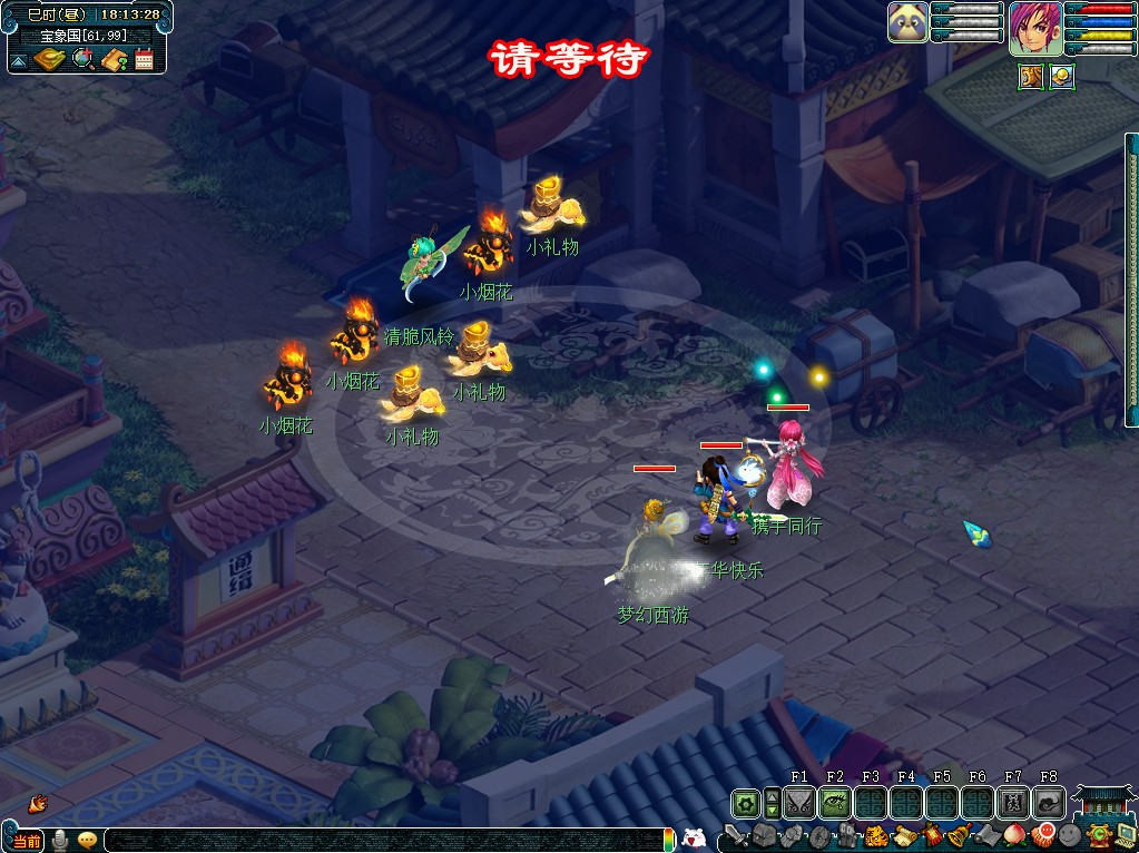 嘉年盛宴共装点,活动期间每个半点,三界会出现各种盛典用品。玩家(等级≥30,队伍人数≥3)组队前往三界各处去收集一些吧(进入战斗)。战斗结束后可以获得丰富的经验、金钱以及道具奖励。还有机会获得庆典礼糕装饰物,上交给各个场景内的“嘉年华诞辰典礼糕”可以额外获得奖励。