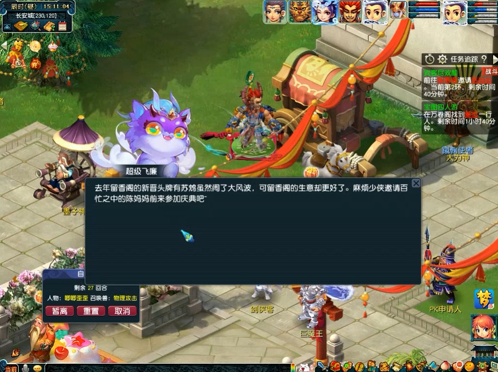重复领取式环任务。嘉年华活动第二阶段全天,玩家(≥30级,至少3人组队)可在长安城(235,115)超级飞廉处领取任务。