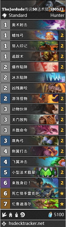 TheJordude打到传说50名的法术猎,卡组是用的HCT第一赛季上ShtanUdachi的,一张没改,这环境法术猎很友好,适合上分