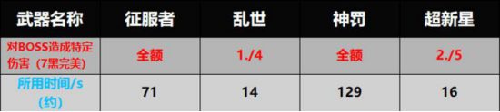 从表中可以看出,超新星打出全额伤害,也就是将寒霜巨兽打死(设定条件为樱觉醒开启状态)只需2分之5乘以16,也就是约40秒,而乱世约需要4×14,约为56秒,征服者与神罚以表中数据紧随其后。有些人可能觉得太慢,但是不要忘了这只是小编一个人在打BOSS哦。