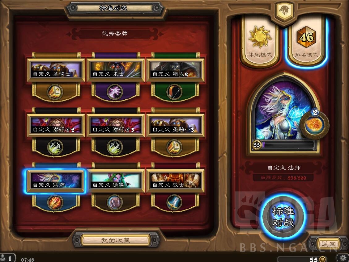 4级到传说主要是一边尝试卡组一边冲,我依次尝试了奇数猎、奇数骑、奇数贼,其中以奇数贼效果最好。上传说时4500多名,主用奇数贼副用奇数猎最高冲到200名左右。由于环境中以偶数骑数量最多,术士次之,我这两套卡组打偶数骑都是劣势,奇数猎打术士虽是优势,但基本只能用来针对术士和任务贼,遇到其他职业完全没法打。于是,在200左右摩擦了几天后,排名居然每况愈下,一度掉到了1600多。这个时候,奥秘法走进了我的视线,结合我自己的风格调整若干单卡后,我用这套提速奥秘法在两天内就重返德军总部回到100多名,并且在接下来一步一脚印打进前50。
