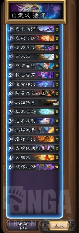 接下来是卡组。与目前版本常规的奥秘法相比有3张牌的不同,我舍弃了炎爆和双吸血蚊,取而代之的冰环和双奥秘守护者。其实在上周三我开始使用此套奥秘法时,与当时的常规版本有5张牌的不同,除了上述3张外,常规奥秘法还会带血法和软,而我选择了双阿曼尼。在gayuan聚聚本周的周报中,奥秘法已经满编了阿曼尼。