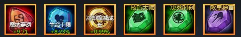 ①魔抗穿透纹石+蓝色百分比生命+黄色冷却缩减成长+绿色技巧大师+绿色决死时刻+紫色欧皇神言