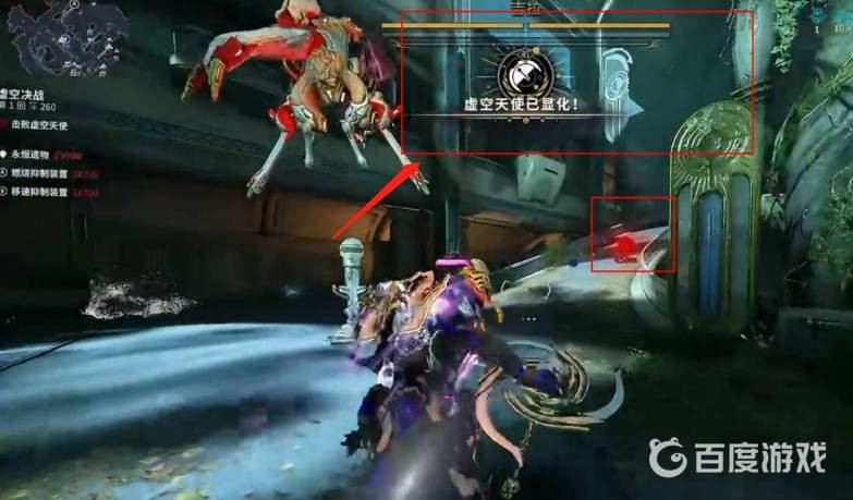 在玩家击杀掉一部分敌人后,任务提示会显示虚空天使已显化,出现红色目标点,玩家需要按照提示前往,如下图所示