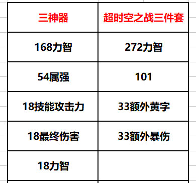 首先对比一下三神器,整合一下属性可得,这里注意一下 超时空之战三件套选取的是下级品级的属性 等属性完全曝光后选取最上级 可能还会多一点属强和力智
