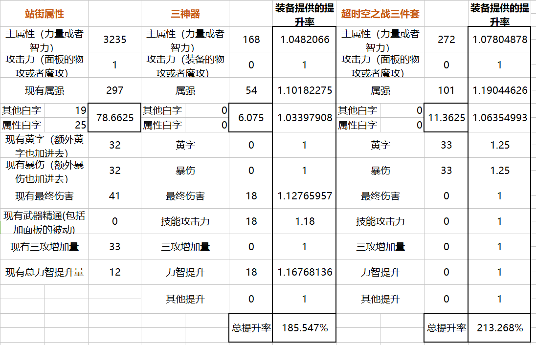 这里只填了影响这两套装备提升率的词缀,其他的不需要填写,还有就是三神器、超时空三件套自带属强会影响属白,所以虽然这两套不带白字,但是会因为属强而多出来白字。还有就是我把耳环50力智、左槽12属强、右槽15属强的附魔算在了基础上。大家应该可以看出来,新套装已经比三神器强很多,更何况还是下级。