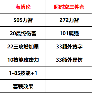 对比一下 感觉还是差不少的,不过,考虑到组队吃奶,力智变高还有新套装是下级品级这两种情况,应该新套装比海博伦差不多或者超出一点点,以上就是对于所有情况的分析。总结: