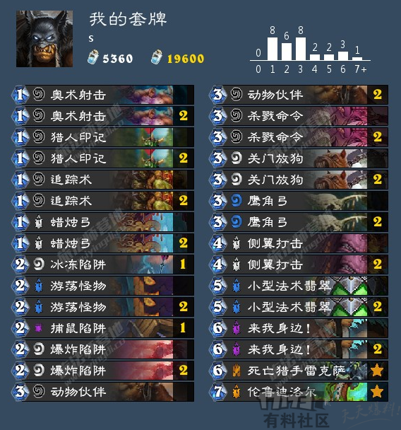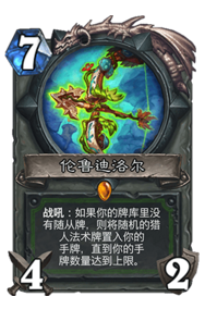 7费4/2武器,说白了连4费都价值不到,但是效果却相当imba,直接补猎人法术到手牌爆炸,不仅是强力的补牌手段,而且因为是超越套牌外的法术,充满随机性,换句话理解就是奇迹,让猎人可以有充足法术牌应对场面。如果已经变身DK,那么随从也是充足的,根本不怂对手,有牌就是大爷不是说着玩的。