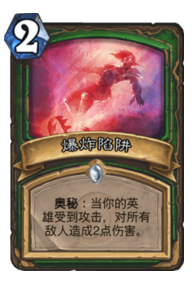 作用和奥数射击类似,不同的是一个是主动,一个是被动,奥数射击是单体,爆炸陷阱是aoe,这张卡一方面可以对付快攻的铺场,对于快攻前期的场面,几乎都是2-3血,如果一个爆炸解决不了,那就再来一个,或者来一波放狗也是可以的,有了爆炸和放狗,对于前期狂铺小喽啰的快攻的抵抗力增强了不少。