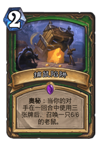 对手一回合使用三张卡,则召唤6/6野兽鼠,这张卡主要是为了对付快攻,一回合3张在快攻进入3费以后,都是很经常的事情,而一般对手下完3个,我们一个老鼠出来,对手就懵逼了,到我们回合,老鼠就可以攻击了,可以对快攻前期的场面起到很强的抑制作用,但是因为仅对快攻有用,适用性不广,故而只带一张。