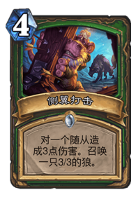 不带能减费的飞翼冲击,一方面是因为我们随从少,开始有随从是3费动物伙伴和5费一波狼,要触发飞翼冲击效果就要牺牲,很别扭,即便可以减费。而侧翼打击不同,打3而且能召唤3/3站场,解场加站场,或者说补刀加站场,这3点伤害综合算起来也就价值1费多一些,贵在稳定,不需要条件,且是二卡合一,优秀。