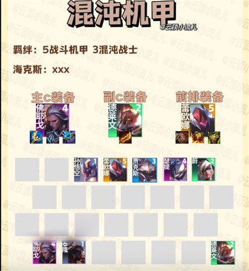 阵容组成:佛耶戈+德莱文+日女+猴子+贾克斯+瑟提+楚雨荨+男刀。组成5战斗机甲3混沌战士。