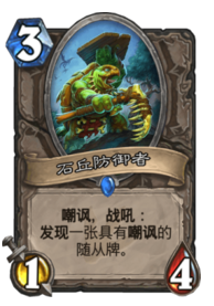 在这套快攻卡组里面,这张卡是打中后期用的,用来找守日者强化自己的场面,或强行用小弟和对手大生物五五开;又或者找弗丁,提供强大的后期能力,还可以找到始生幼龙解场,都是我们所需要的,当然这只是理想情况,毕竟版本中嘲讽生物还是很多的,精确找到还有难度,需要一定的运气,但好的选择依然很多,就当为了这样的梦想带上石丘也未尝不可。只需要记住不要3费作死亏场面就好。