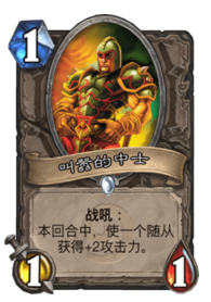 有的卡组带的是老兵,而笔者选择的是各一张,老兵和中士都有各自的好处,老兵在于持续收益大,本身2/1比叫嚣厉害,且一回合之后强化的1攻依然还在,而叫嚣强大的地方则是在于当回合爆发,2点瞬时攻击可以配合小生物把对手中等生物换掉,降低当回合的解场成本,但是弊端也很明显,当你不是拿来解场的时候,综合收益就不如老兵了,因此二者各有千秋,各带一张。