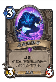 所有随从攻血互换,一般有两个用途,一个是削弱对手生物的血量,让我们可以降低解场成本,另一个用途就是增强我方生物的攻击力,实现一轮强力爆发,但是我们随从似乎并不具备爆发的潜力(血量不够高),所以用途只有一个:解场。在对手下一些血量高于攻击的墙的时候,如果没有沉默在手,完全可以进行一波攻血互换,降低解场难度。(其实主要是对付德鲁伊的传播瘟疫!!!切记打德鲁伊不要乱用,一定要防传播瘟疫)