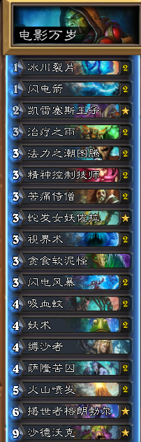 可以看到只有撼世者是元素牌了,缚沙者就是为了抽撼世者而准备的,这样可以保证最快的凑齐K牌!2王子无需解释,牺牲了很多常用卡,起手只要有一定得留下,你要知道很多时候我们可以靠随从直接抢死对面的啦!