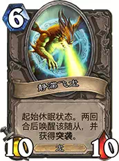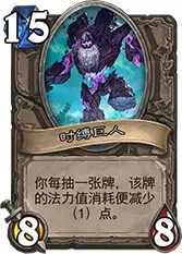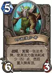这张卡的效果相当给力,可以定向找法术,而且费用减5费,尤其是对那些高费法术很给力的职业来说,这张卡对于他们来说就是张神卡,而且5费6-3的身材也不错,大概亏一费,而下个回合便可以抢到5费的节奏,这边是这张卡的强力效果。