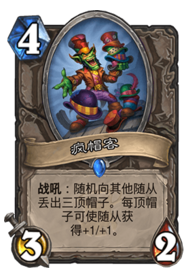 4费3/2,只价值2费,但是效果可以随机向随从丢出3个1/1buff,虽然存在给对手buff的风险,但是如果场面上只有我们的随从,那么buff就是稳定的,我们自然就不会亏,非常适合我们铺场的思路。