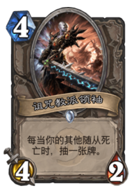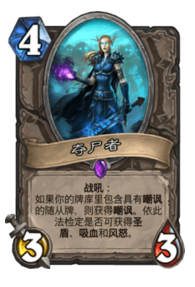 4费3/3,检索牌库,有圣盾、嘲讽、风怒、吸血的话,则会获得这些属性,我们主要是靠奥拉基,则可以变成3/3圣盾嘲讽风怒,所以最好祈祷奥拉基不上手,这样夺尸者就能以最强形态登场,而即便是最差情况,也有嘲讽,虽然亏了一费但也可以和快攻抗衡一下,下限亏一费,上限赚1-2费,完全可以接受。