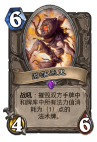 身材上亏了1.5费,效果价值却远胜于此,一来这张卡不会坑到自己,因为我们没有1费法术,二来现在环境中对手都有1费法术,我们这个摧毁作用可以对对手产生一定的影响,而在对阵到心火牧这种有1费法术作为关键卡的套牌,那就是毁天灭地,直接劝退。