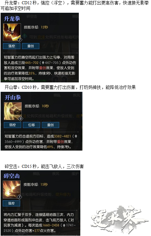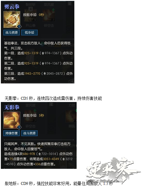 1)劈云掌(0cd,平a技能。击中敌人后获得怒气。有三段效果。):基础拳法,攻击前方敌人,命中敌人后获得怒气,共三段。第一二段伤害不变,第三段伤害翻倍。