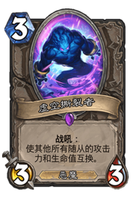大众的认知是主要交换对手的随从,让我们过墙更容易,而这套牌中可能更多的用于进攻上,我们有好几个血量极高的随从,比如:地穴领主,血量养起来了,配合到虚空撕裂者经常可以有5+的爆发输出,打对手一个措手不及。