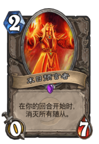 末日自古就是对阵快攻的神卡,2费压场,抢回3费先手,同时解了对手前2费场面,让对手的节奏掉链子,就是目前环境而言,只要末日准时下,因为几乎没什么快攻带炼金师的,所以2费清场的概率高达99%,抢节奏的神卡,即便说前期没抽到,到中后期扔下去也能吸收7点伤害或者逼对手交沉默卡节奏。