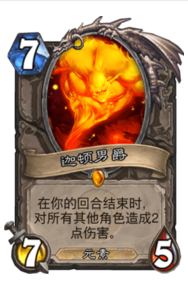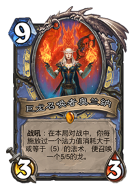 9费3/3,每使用一张5费及以上法术,战吼便可以召唤一个5/5,在我们使用了大量高费aoe以后,这一张9费卡就是一地5/5+1个3/3,铺场能力贼强,在后期算是一手杀招了,毕竟DK的水元素是慢慢刷的,这个的爆发力更强,对手解不掉那就是一波带走了。