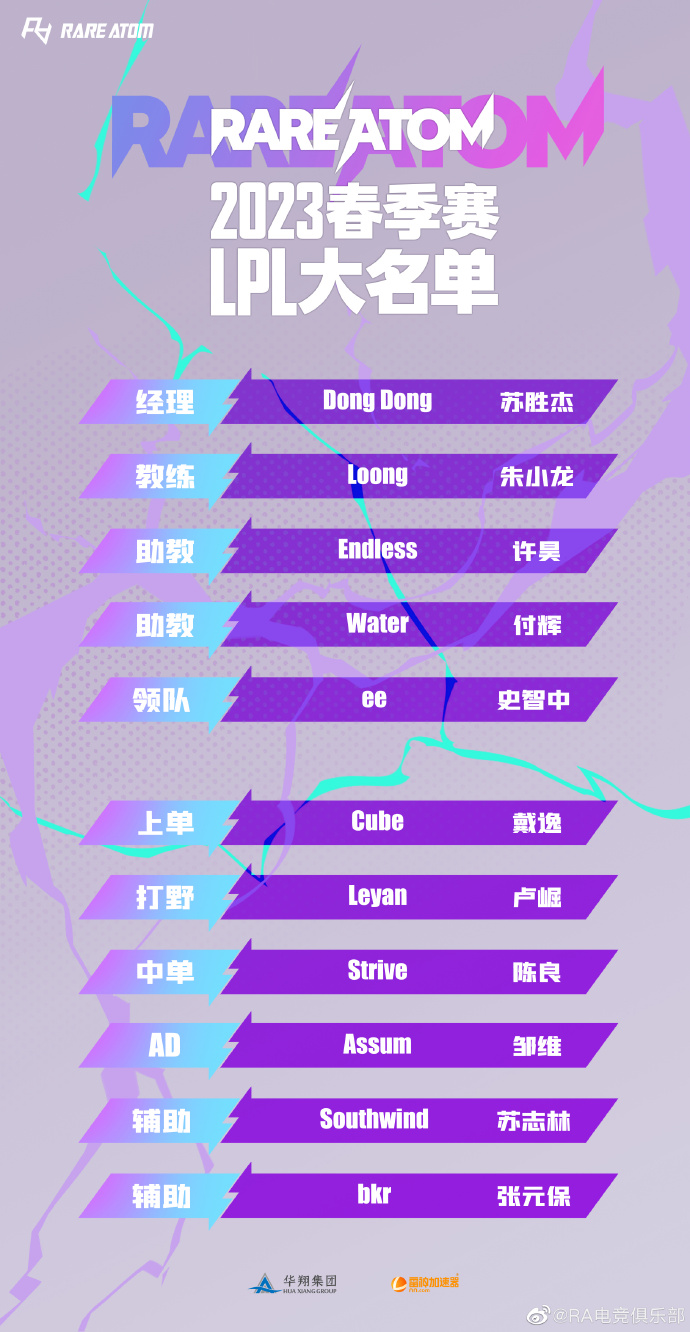 今日RA战队宣布2023春季赛大名单,上中野依旧是Cube、Leyan、Strive,下路则是Assum携手Southwind。