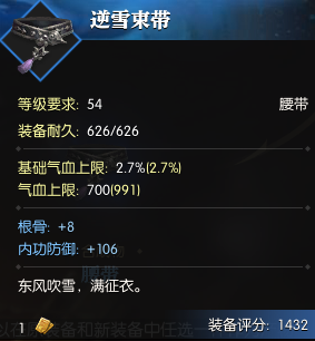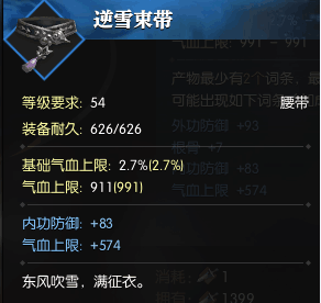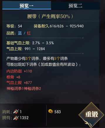 因为首先是洗词条,以【根骨+内功防御】和【气血上限+内功防御】54蓝腰带各一条为例。两条腰带的内功防御换成外功防御也可以,但是最好一致,因为我们想要的结果是【根骨+气血上限】。大家都是文化人,3选2和4选2哪个概率更大,大家都懂。