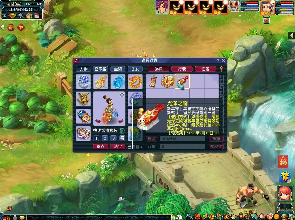 大受好评的年兽之靴搭配光泽之刷的组合再次登场!通过积攒新春灵气完成新春小目标即可获得,有效期至2023年2月10日12:00。好鞋子当然要经常擦拭,年兽宝宝精心准备了“光泽之刷”,使用可延长年兽之靴48小时有效期,最长可延长至2022年4月2日8:00。侠士每日登陆即可获得一把“光泽之刷”,领取10点太清符奖励时可额外获得一把,每日最多获得两把,快去擦拭年兽之靴吧!