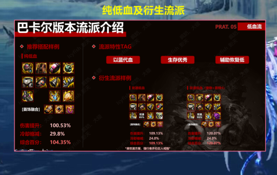 纯低血。以蓝代替血,生存能力优秀,比较的肉,在巴卡尔团本挺受欢迎。在纯低血的基础上,还衍生出攻速低血流派,伤害要更高些。
