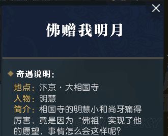 逆水寒有很多非常有趣的奇遇,这些奇遇增强了玩家在江湖中的代入感,让游戏可玩性增加。佛赠我明月正是其中之一,那么该奇遇怎么完成呢?小编下面就将带来逆水寒佛赠我明月奇遇完成方法,一起来看看吧。