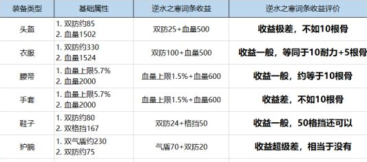 下图总结了65阶段所有【紫色或百炼】最高级装备带【逆水之寒】词缀的实际收益。