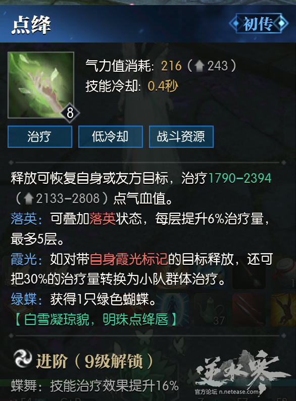 更重要的是,这是一个群体奶人技能。彩翼在cd,0蝴蝶,全队残血怎么办?先垫一口新雨,再对着绑了落霞的T来口初绽,再一口新雨可解。该技能在你释放的时候会有两次治疗,也就是图上面板中的1297 + 402 ~ 1743 + 580. 加上5层落英状态,全队奶2k~3k,奶量还是不错的,对比点绛也只是单体奶2k~3k。