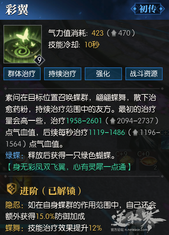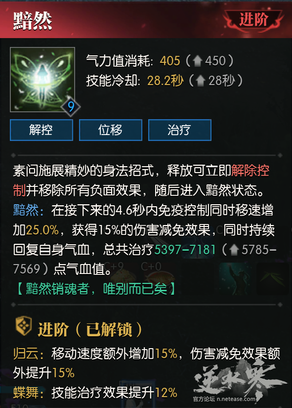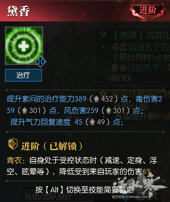 解读:素问唯一可进阶心法技能。主提升奶量,回蓝速度,附带提升伤害。可缓解奶不够,蓝不够的问题。进阶后附送受控伤害略微减免,简直良心!