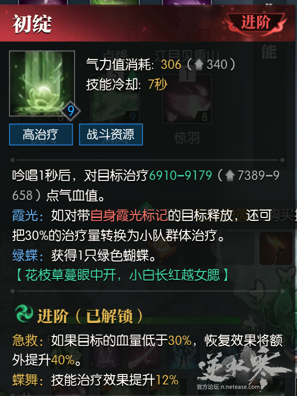 解读:素问活死人肉白骨的技能,进阶后能一口把除铁衣外的血皮一口奶满。但是请不要过度依赖“急救”这个技能。容易暴毙。请和我念:进阶的主要目的是治疗效果提升12%。
