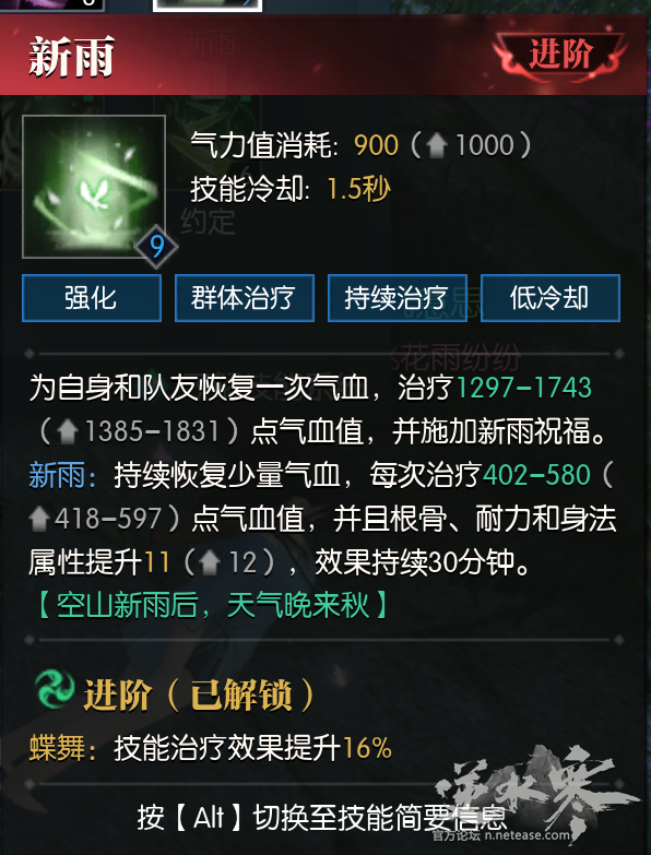 论武由于平衡属性和技能等级的原因,耗蓝极多的缺点反而不再算问题。而且因为走位,出招等各种问题,蝶恋花·梦染的释放频率不甚理想。此时不妨将新雨当成主群奶技能。