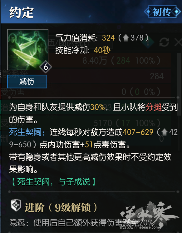 但是进阶优先度不是很高,个人认为由于已经平摊伤害,额外的20%伤害减免就显得无关紧要。再者,该技能升级仅提升蓝耗和链子伤害,而那个伤害.副本中,可拯救主T于水火。比如初绽CD,主T血皮,瞬发约定救回主T,再接蝶恋花,新雨等群回血把整队血抬回来。没绿蝶也没关系,5秒内还是可以小小松口气的。