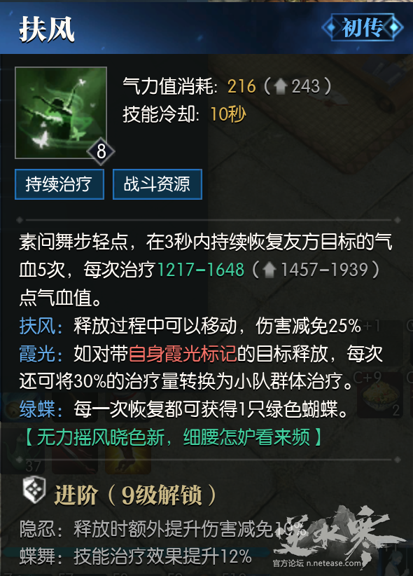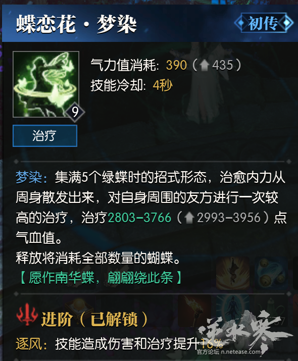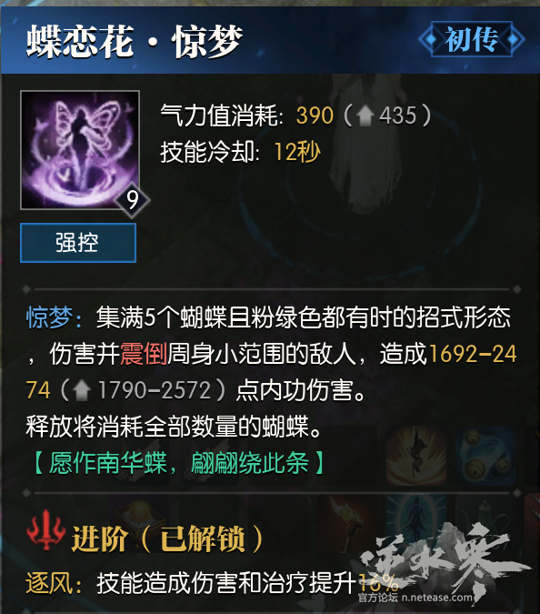 不过其实最担心的应该是怎么攒够放该技能的蝴蝶。在恰当的时机攒够蝴蝶,震倒来犯之敌。对于副本来说相对容易,但是对于论武和战场而言,每一个蝴蝶都是宝贵的资源,到底是交解控然后蝶恋花·梦染奶一波。还是震倒敌人,扶风逃跑+奶再蝶恋花·梦染,这是个问题。