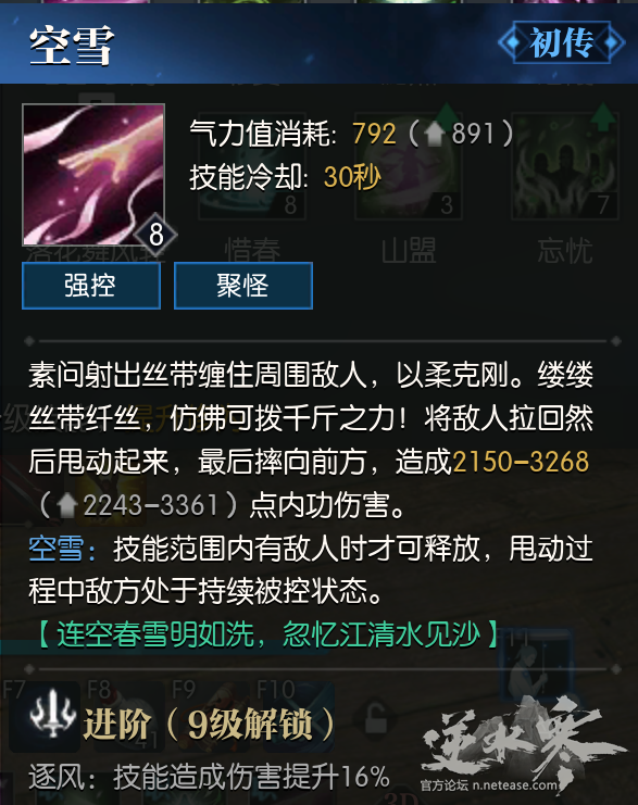 解读:空雪在现版本作为唯一可以控boss的技能,中等的CD,无指向以自己为中心的范围控制,问鼎第二梯队之首。不过其劣势也很明显,不能断招,攻击范围也较短,控制的时候也不像尬舞(落花舞风轻)可以免控。